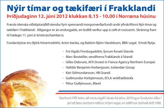 Þriðjudaginn 12. júní 2012 klukkan 8.15 - 10.00 stendur Fransk-íslenska viðskiptaráðið fyrir spennandi morgunverðarfundi í Norræna húsinu undir yfirskriftinni Nýir tímar og tækifæri í Frakklandi. Aðgangur er án endurgjalds, en boðið verður upp á café et croissants.