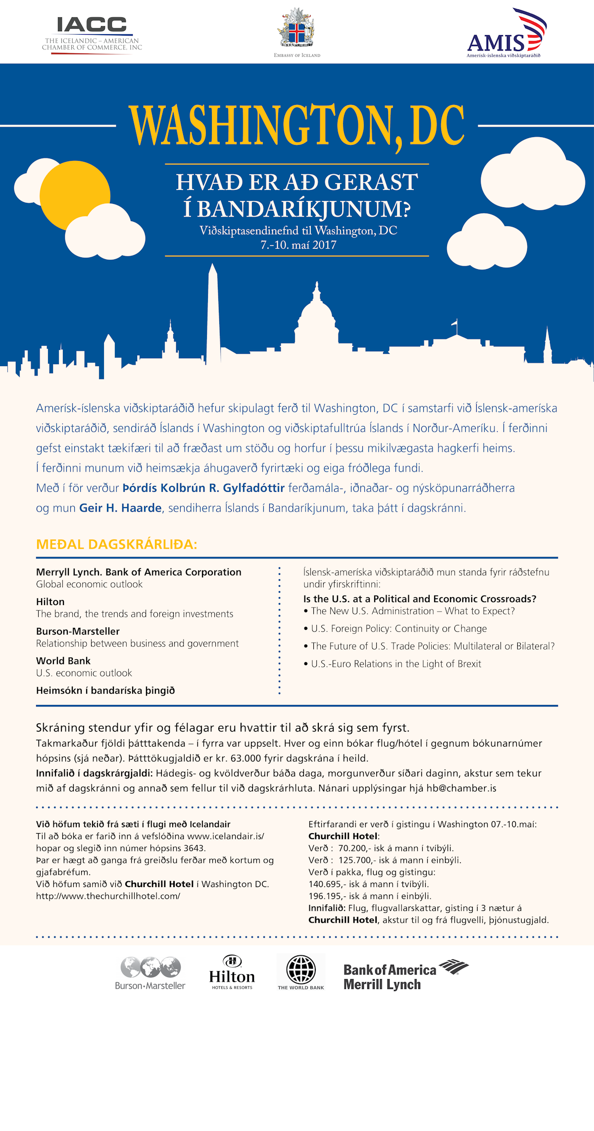 Amerísk íslenska viðskiptaráðið hefur skipulagt ferð til Washington DC í samstarfi við Íslensk ameríska viðskiptaráðið, sendiráð Íslands í Washington og viðskiptafulltrúa Íslands í Bandaríkjunum. Í ferðinni gefst einstakt tækifæri til að fræðast um stöðu og horfur í þessu mikilvægasta hagkerfi heims.