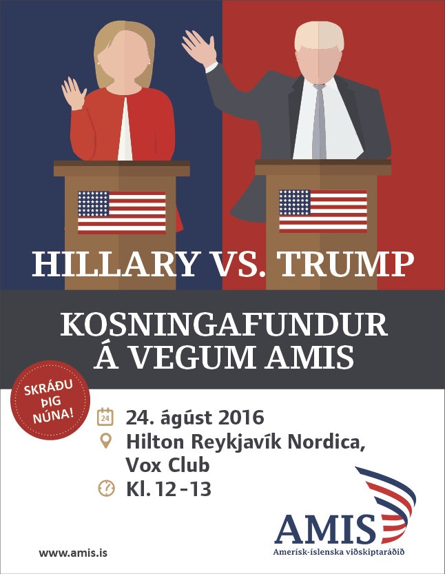 Amerísk-íslenska viðskiptaráðið (AMIS) heldur fund 24. ágúst n.k. í tengslum við forsetakosningarnar í Bandaríkjunum 8. nóvember. Hvað er að gerast í kosningabaráttunni vestra? Getur það verið að forsetaframbjóðandi í Bandaríkjunum komist upp með að kalla andstæðing sinn djöfulinn? Er tölvupóstmáli …