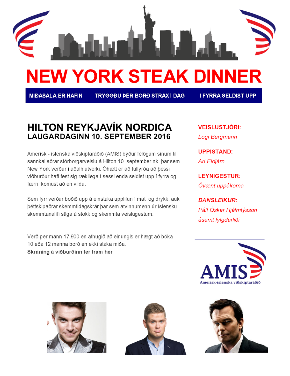 AMIS býður félögum sínum að taka þátt í árlegu New York kvöldi laugardaginn 10. september. Sem fyrr verður boðið upp á einstaka upplifun í mat og drykk, auk þéttskipaðrar skemmtidagskrár þar sem atvinnumenn stíga á stokk og skemmta veislugestum. Sjá nánar á vef Amerísk-íslenska viðskiptaráðsins.