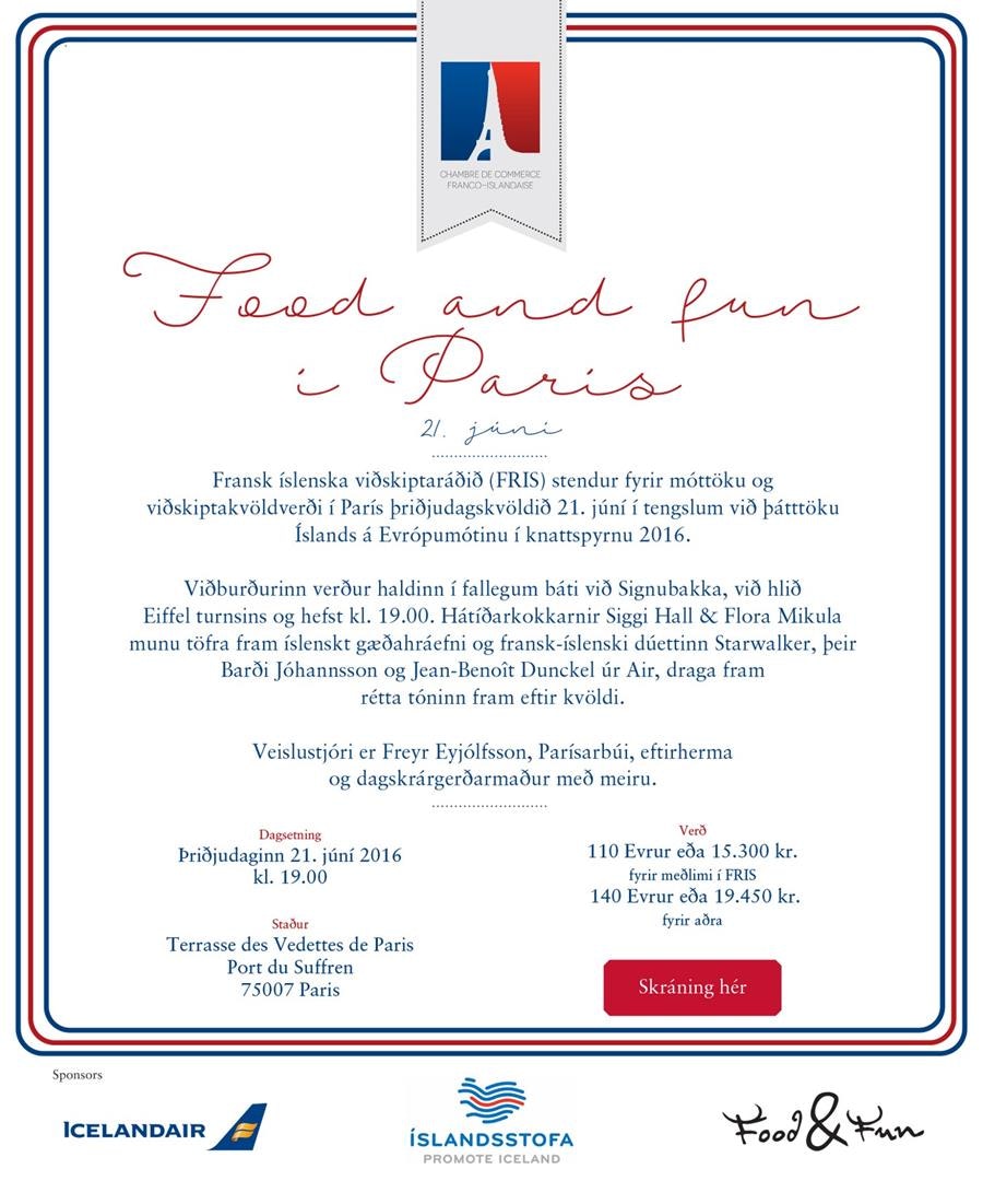 Fransk-íslenska viðskiptaráðið (FRIS) stendur fyrir móttöku og viðskiptakvöldverði í París þriðjudagskvöldið 21. júní í tengslum við þátttöku Íslands á Evrópumótinu í knattspyrnu 2016. Viðburðurinn verður haldinn í fallegum báti við Signubakka, við hlið Eiffel turnsins, og hefst kl. 19:00.