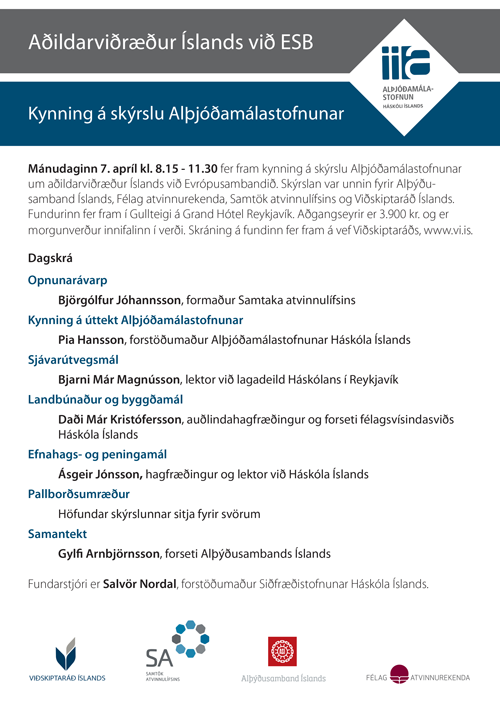 Mánudaginn 7. apríl kl. 8.15 - 11.30 fer fram kynning á skýrslu Alþjóðamálastofnunar um aðildarviðræður Íslands við Evrópusambandið. Skýrslan var unnin fyrir Alþýðusamband Íslands, Félag atvinnurekenda, Samtök atvinnulífsins og Viðskiptaráð Íslands. Fundurinn fer fram í Gullteigi á Grand Hótel …