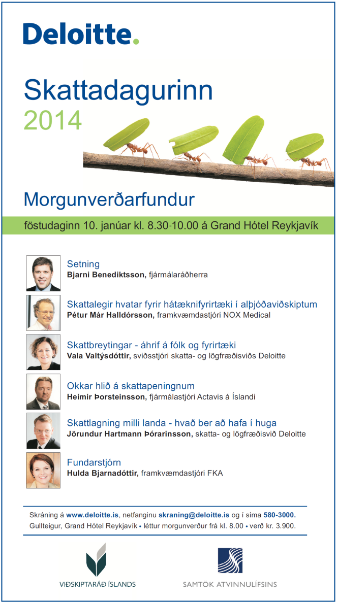 Hinn árlegi Skattadagur Deloitte, í samstarfi við Viðskiptaráð Íslands og Samtök atvinnulífsins verður haldinn að Grand Hóteli Reykjavík þriðjudaginn 13. janúar 2015 kl. 8.30-10.00. Húsið opnar kl. 8.00 með léttum morgunverði. Verð kr. 3.900. Skráning á fundinn er á netfanginu skraning@deloitte.is