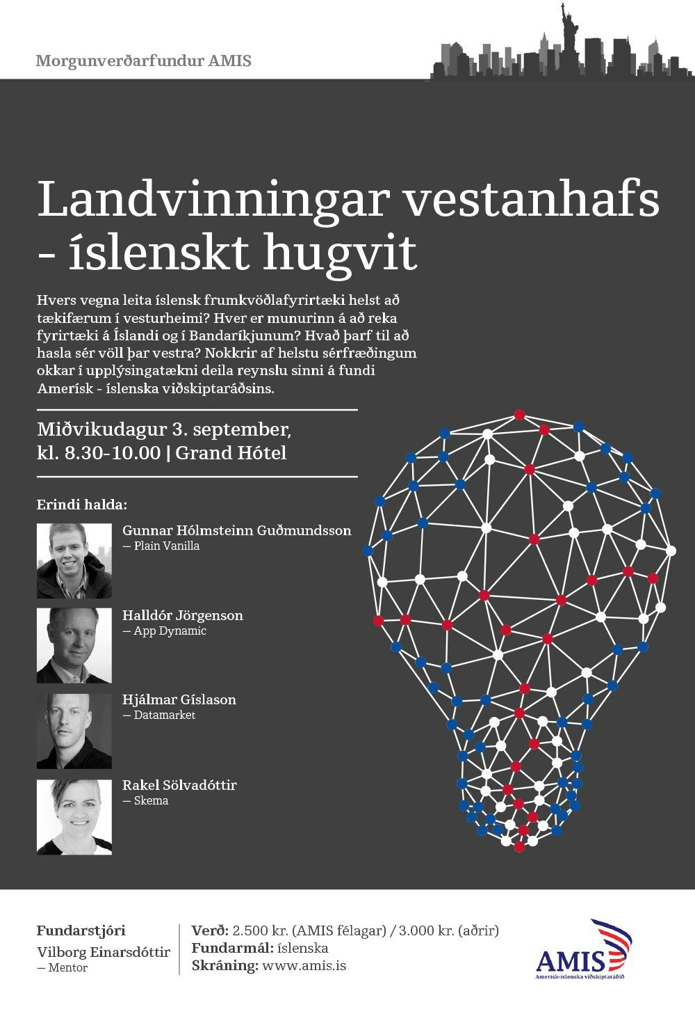Amerísk-íslenska viðskiptaráðið heldur morgunverðarfund miðvikudaginn 3. september á Grand Hótel Reykjavík. Á fundinum verður rætt um helstu ástæður þess að íslensk frumkvöðlafyrirtæki leita helst að tækifærum í vesturheimi, hver munurinn sé á því að reka fyrirtæki á Íslandi og í Bandaríkjunum og …