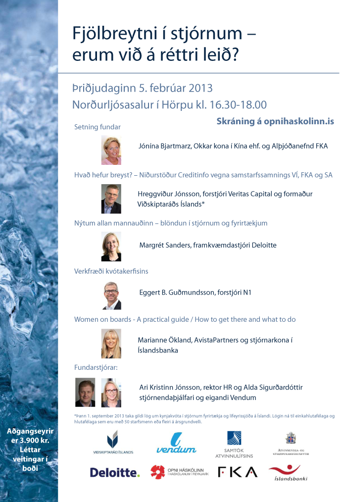 Þriðjudaginn 5. febrúar fer fram ráðstefna sem ætlað er að ýta undir umræðu um kynjahlutföll í stjórnum. Hún er liður í að fylgja eftir samstarfssamningi SA, FKA, Viðskiptaráðs Íslands og Creditinfo sem undirritaður var á vordögum árið 2009 um að efla hlut kvenna í stjórnun íslensks atvinnulífs …