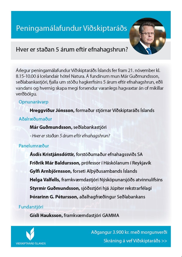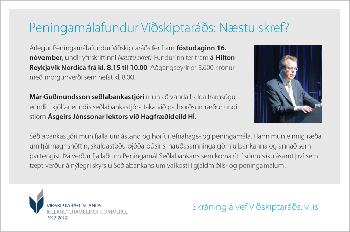Árlegur Peningamálafundur Viðskiptaráðs fer fram föstudaginn 16. nóvember undir yfirskriftinni Næstu skref? Fundurinn fer fram á Hilton Reykjavík Nordica frá kl. 8.15 til 10.00. Hreggviður Jónsson, formaður Viðskiptaráðs, flytur opnunarávarp og mun Már Guðmundsson seðlabankastjóri að vanda halda …