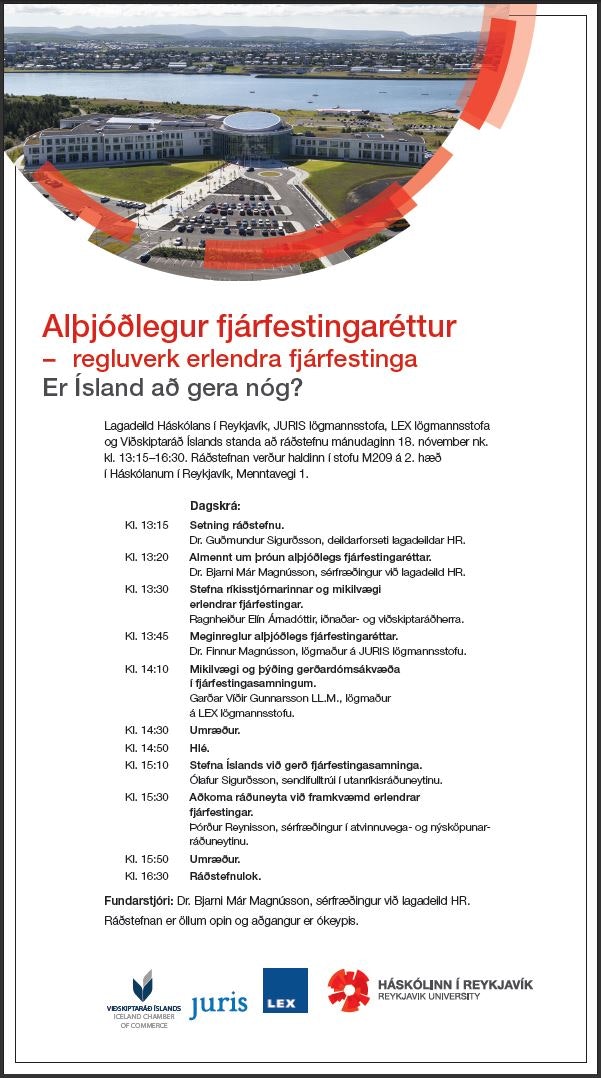 Lagadeild Háskólans í Reykjavík, JURIS lögmannsstofa, LEX lögmannsstofa og Viðskiptaráð Íslands standa að ráðstefnu um alþjóðlegan fjárfestingarétt og regluverk erlendra fjárfestinga mánudaginn 18. nóvember kl. 13.15-16.30.