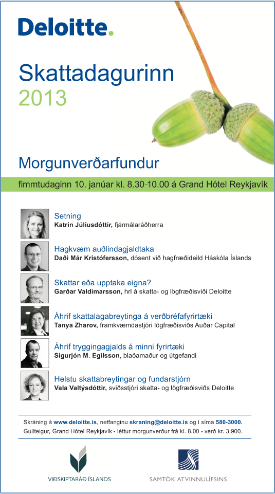 Hinn árlegi Skattadagur Deloitte, í samstarfi við Viðskiptaráð Íslands og Samtök atvinnulífsins verður haldinn að Grand Hótel Reykjavík fimmtudaginn 10. janúar 2013, kl. 8.30-10.00. Boðið verður upp á léttan morgunverð frá kl. 8.00. Skattamál skipa sífellt stærri sess í efnahagsumhverfi okkar og er …