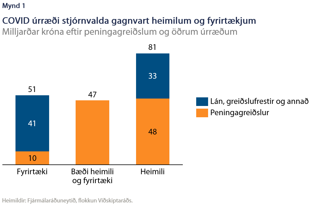 Samkvæmt greiningu Viðskiptaráðs á úrræðum stjórnvalda hafa úrræðin að megninu til runnið til heimila eða sem nemur 81 milljarði króna (mynd 1)[1]. Úrræði að umfangi 51 milljarði króna hafa á sama tíma runnið til fyrirtækja. Úrræðin eru afar misjöfn, t.d. lán í samanburði við beinar peningagreiðslur. Þannig fóru 48 milljarðar króna sem rekja má til faraldursins í beinum peningagreiðslum til heimila, nærri því fimmföld sú fjárhæð sem rann til fyrirtækja.