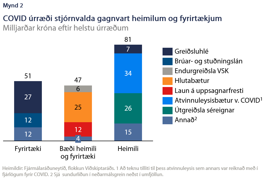 [2] Fyrirtæki: Tekjufalls- og lokunarstyrkir og frestun gjalda (staðan febrúar). Bæði heimili og fyrirtæki: Ferðagjöf, laun í sóttkví, samkeppnissjóðir vísindarannsókna og nýsköpunar. Heimili: Aðgerðir vegna hópa í viðkvæmri stöðu, lenging tekjutengingar og desemberuppbót atvinnuleysisbóta, stuðningur við sveitarfélög sem beint er til viðkvæmra hópa, úrræði til námsmanna, barnabótaauki, stuðningur við listamenn, íþróttir o.fl.