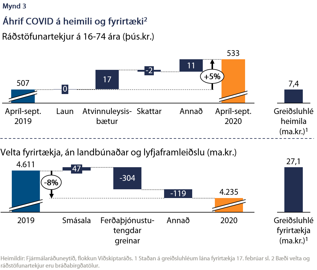 Ein birtingarmyndin er að kreppan hefur almennt lagst af meiri þunga á fyrirtæki en heimili, eins langt og slíkur samanburður nær. Annars vegar vegna þess að ráðstöfunartekjur heimila jukust almennt um 5% milli ára fyrsta hálfa ár faraldursins en til samanburðar drógust tekjur fyrirtækja saman um 8% milli ára á síðasta ári. Hins vegar nam greiðsluhlé lána hjá fyrirtækjum 27,1 ma.kr. 17. febrúar sl. til samanburðar við 7,4 ma.kr. hjá heimilum – nærri því fjórfaldur munur. Jafnvel þótt tekið sé tillit til heildarskuldsetningar, sem er 14% meiri hjá fyrirtækjum heldur en hjá heimilum, breytir sú niðurstaða því ekki að líklegra er að fyrirtæki eigi erfiðara með að greiða af lánum.