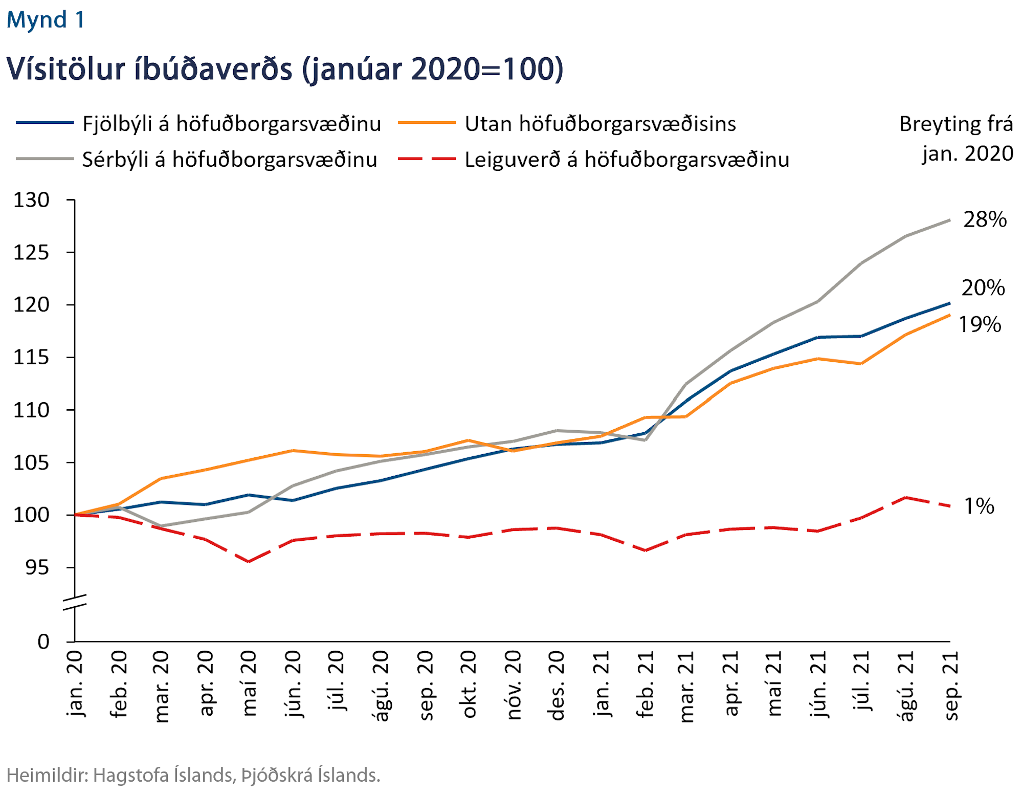Allt þetta breyttist í kjölfar þess að heimsfaraldurinn skall á af fullum þunga í mars 2020. Um mitt ár 2020 fór að bera á aukinni veltu auk styttri sölutíma og er leið á árið fylgdu hraðari verðhækkanir í kjölfarið, en á höfuðborgarsvæðinu voru þær um 3,6% milli ára í mars en 6% í október. Þessi þróun kom svo fram af fullum krafti á þessu ári og hefur íbúðaverð nú hækkað um 15% milli ára á landinu öllu, þar af 21% í sérbýli á höfuðborgarsvæðinu (mynd 1). Öðru gegnir um leiguverð sem hefur nánast staðið í stað frá ársbyrjun 2020.