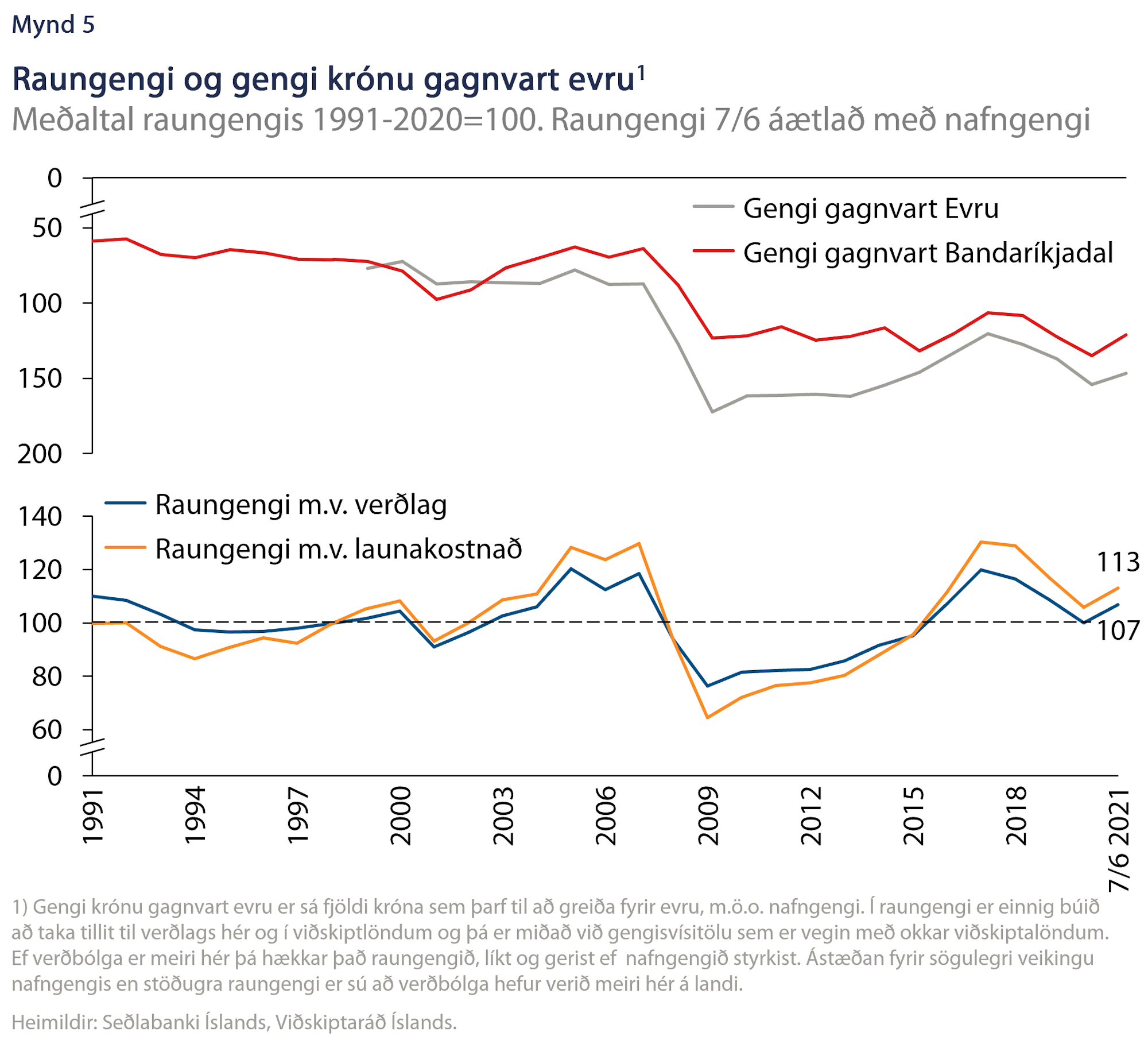 Eins og fram kom hér að framan eru sterkar vísbendingar um að hagkerfið hafi ekki getað til lengdar staðið undir gengi krónunnar á árunum 2017 til 2018. Aftur á móti virðist það gengi sem var viðvarandi síðasta eina og hálfa árið fyrir heimsfaraldurinn vera í takt við getu hagkerfisins, enda í ágætu samræmi við sögulegt meðaltal raungengis og mat Seðlabankans á svokölluðu jafnvægisraungengi.