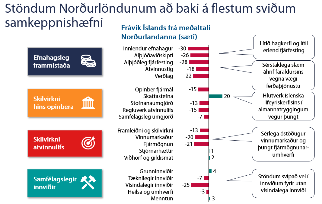 Skilvirkni atvinnulífsins heldur áfram að batna og mælist Ísland í 14. sæti. Þar af er vinnumarkaðurinn enn veikleiki (33. sæti) en afar jákvætt er að sjá fjármögnun hækka úr 32. sæti upp í 27. sæti. Þar gegna nýskráningar á hlutabréfamarkaði og vaxtalækkanir lykilhlutverki. Í samfélagslegum innviðum heldur Ísland áfram sterkri stöðu og er í 9. sæti, sem er hækkun um heil átta sæti. Þar er stærsta breytingin stökk um 10 sæti í tæknilegum innviðum sem er meðal annars vegna aukinna rannsókna og þróunarstarfsemi fyrirtækja.