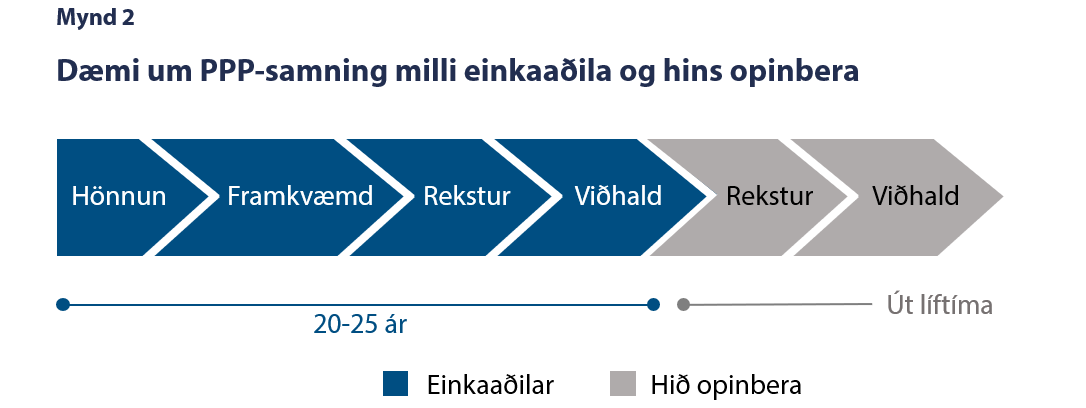 Mögulegt er að einkaaðilar komi að innviðauppbyggingu í samvinnu við hið opinbera. Slík leið er þekkt sem samvinnuleið eða PPP (e. public-private partnership). Dæmigerð uppbygging PPP-verkefna er 20–25 ára samningar þar sem andlag framkvæmdanna er í 100% eigu einkaaðilanna. Þannig er hönnun, framkvæmd, rekstur og viðhald á herðum einkaaðila og að samningstíma loknum er eignin afhent hinu opinbera, ýmist gjaldfrjálst eða gegn fyrirfram ákveðnum skilmálum (mynd 2). Dæmi um slíkan samning eru Hvalfjarðargöngin sem afhent voru ríkinu skuldlaust árið 2018, 20 árum eftir opnun ganganna. Lítil en góð reynsla hefur verið af samvinnuleið á Íslandi en önnur góð dæmi eru Egilshöll, Reykjaneshöllin og Iðnskólinn í Hafnarfirði. Hér er svo vert að leiðrétta algengan misskilning og taka fram að Vaðlaheiðargöng eru ekki PPP-verkefni þar sem ríkið kom að nær allri fjármögnun þeirra, bæði með hlutafé og lánveitingum.